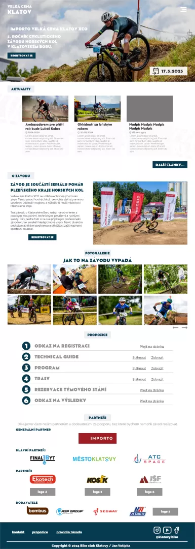 Nové oficiální stránky www.velkacenaklatov.cz vytvořila společnost JVsoft, která se specializuje na vývoj webových aplikací a online řešení. Díky jejich odbornosti a profesionálnímu přístupu máme nyní přehlednou a intuitivní platformu, kde najdete všechny důležité informace o závodu – od pravidel a tras až po možnosti registrace a doprovodné akce.